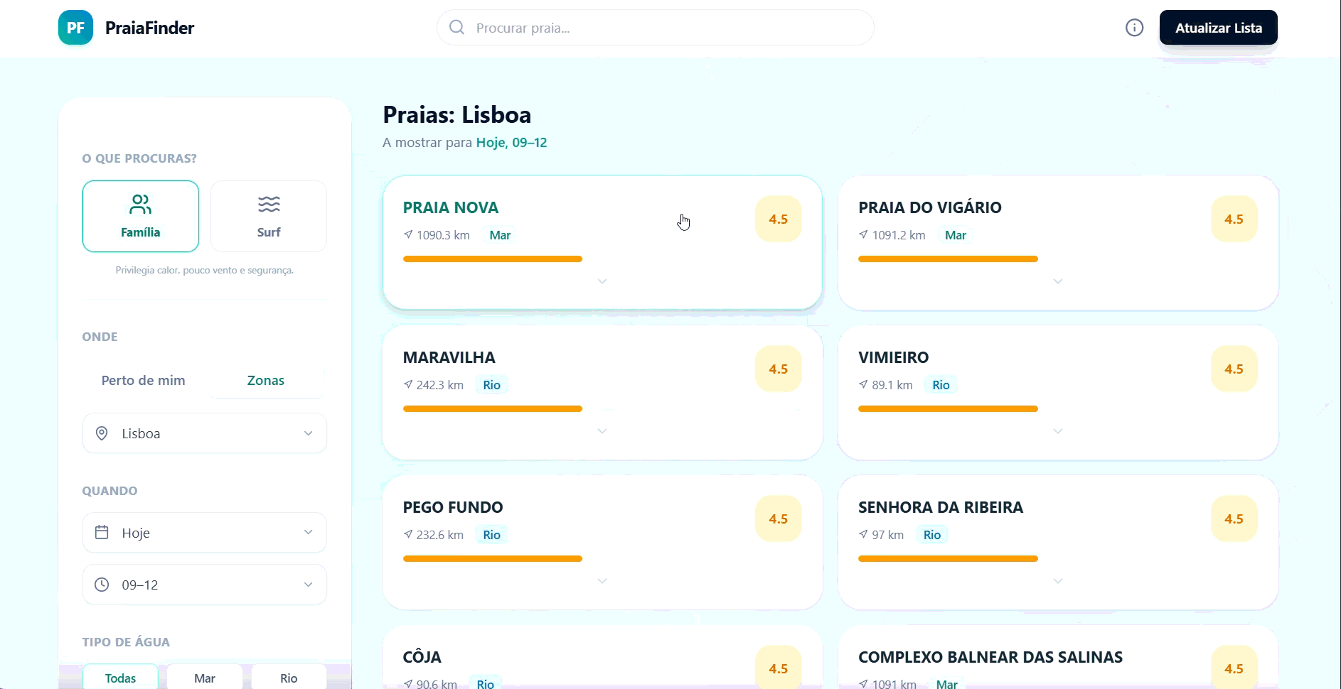 PraiaFinder is a real-time beach recommendation engine that solves the "where should we go?" problem. Instead of drowning users in raw meteorological data (knots, swell period, etc.), it aggregates complex forecasts into a simple 0-10 score based on your intent.
